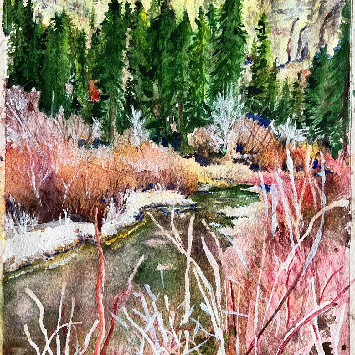 Lynn is an artist in the Black Hills and has been a NPWS member for about 2 years. Her paintings include scenes of the surrounding area as well as other locations. Her work in watercolor offers her more spontaneity and is less cumbersome when painting on the spot, however most of her paintings are done from photographs. Lynn also enjoys photography and when traveling always has a camera by her side. People have always been a fascination for her and she calls the portrait a success when capturing the essence of the individual. Her past work includes watercolor and oil paintings as well as drawings, greeting cards, and occasional pieces of shark tooth jewelry. Many of her current watercolor paintings are a mixture of chalk, acrylics, and small beads attached to give the painting a hint of sparkle when the light hits it at a certain angle. Each painting starts with a drawing and a background wash. Many of her paintings are done using dry brush technique, but she will add wet on wet, float in color or use salt for certain effects.